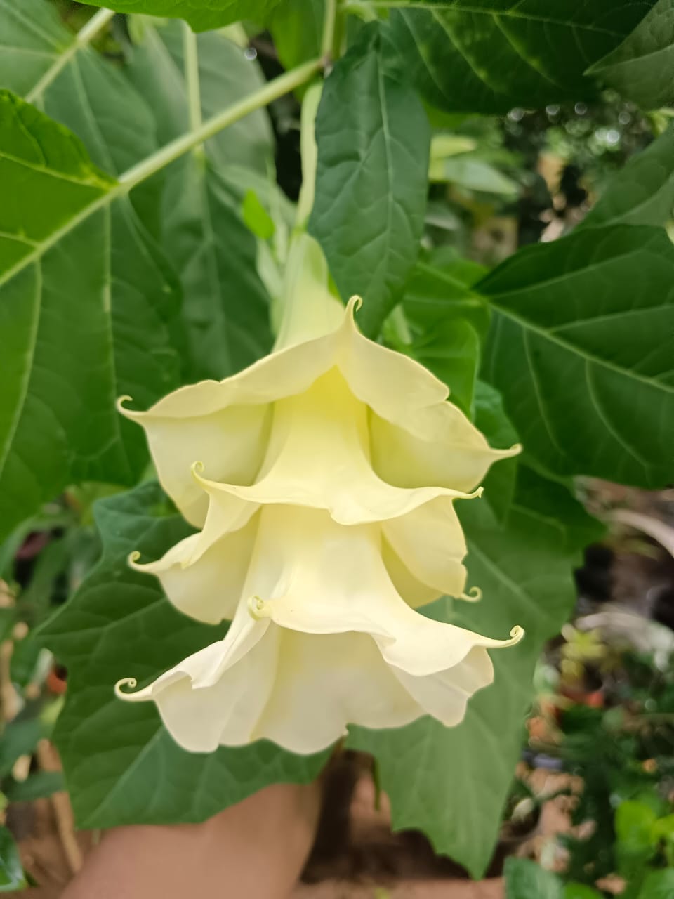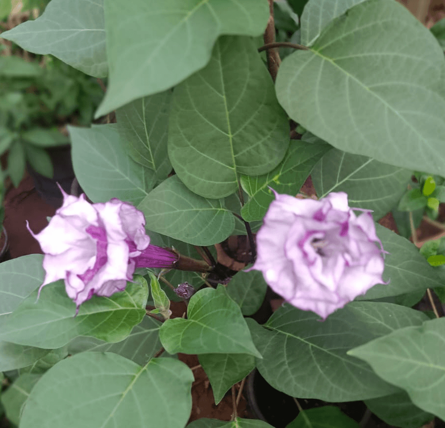 Datura / Trumpet Flower (Datura metel): A plant of mystical beauty, this shrub is famous for its large, fragrant, trumpet-shaped white or purple flowers that often bloom spectacularly at night.