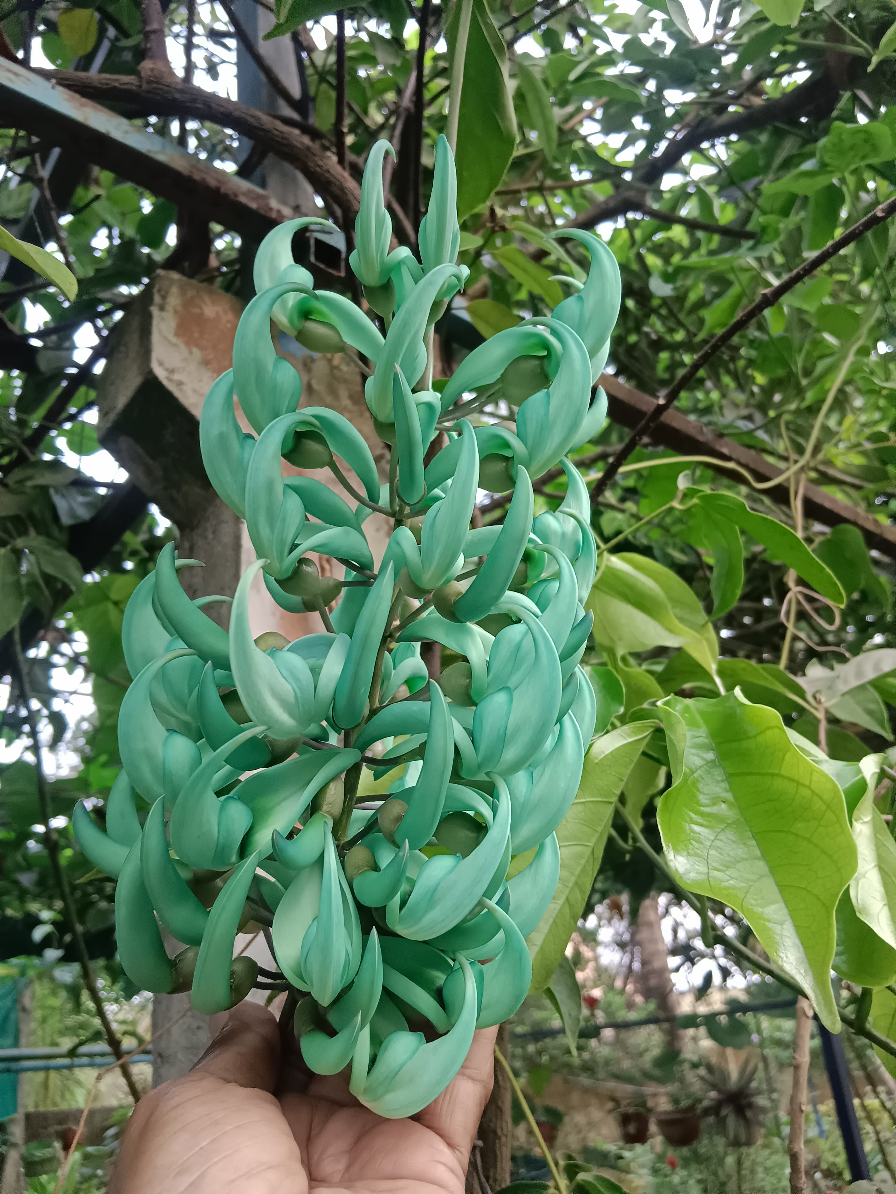 Jade Vine (Strongylodon macrobotrys): A truly spectacular climber, this rare vine is famous for its stunning, claw-shaped, turquoise-green flowers that hang in breathtaking long clusters.